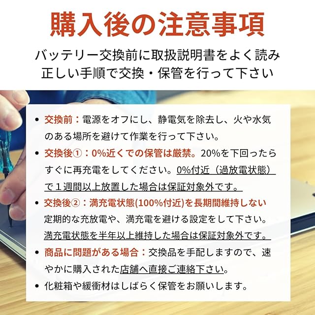 ご購入日から1年間の品質付き。取扱説明書・マニュアル付属(リチウムイオンバッテリーの寿命を延ばす方法)