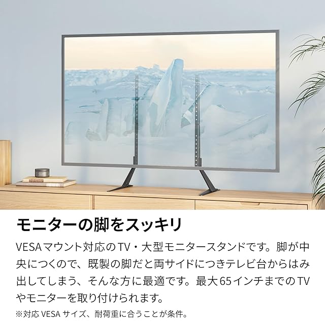 【モニターの脚をスッキリ】VESAマウント対応のTV・大型モニタースタンドです。脚が中央につくので、65インチまでのTVやモニターを取り付けられます。 ※対応VESAサイズの規格を採用し、重量が30kg以下の液晶モニターであること。