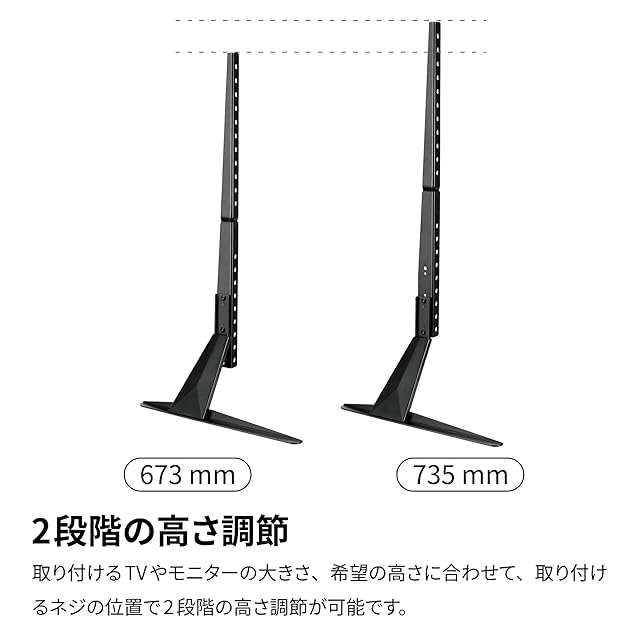 【2段階の高さ調節】取り付けるTVやモニターの大きさ、希望の高さに合わせて、取り付けるネジの位置で2段階の高さ調節が可能です。