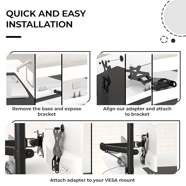 このブラケットはドライバーだけで2分以内で取り付けることができます。既存のベースを取り外し、代わりに当社のベースを所定の位置にねじ込み、VESAマウントに直接接続するだけです。