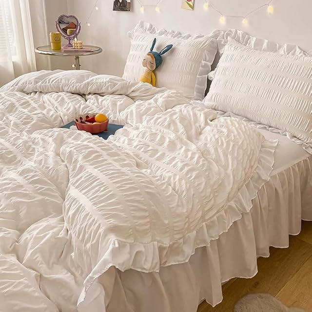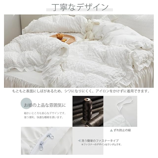 布団カバー 3点セット 4点セット フリル付き布団カバー 寝具カバー 洋式・和式兼用 ベッドカバー 掛け布団カバー ボックスシーツ 枕カバー シーツカバー 肌に優しい ピーチスキン加工 北欧風 四季通用 (シアサッカーホワイト, 3点セット*シングル)