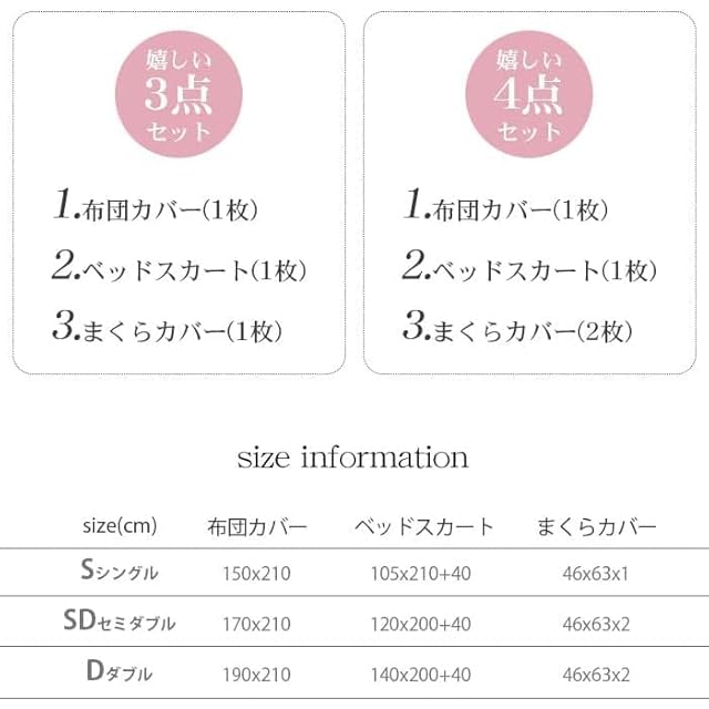 シングル 3点セット 掛け布団カバー(1枚)、150X210cm ・ベッドスカート 100X200+40cm 枕カバー(1枚) 46X63cm セミダブル 4点セット内容と仕様 掛け布団カバー(1枚)、170X210cm ・ベッドスカート 120X200+40cm 枕カバー(2枚) 46X63cm ダブル 4点セット 掛け布団カバー(1枚)、190X210cm・ベッドスカート 140X200+40cm 枕カバー(2枚) 46X63cm