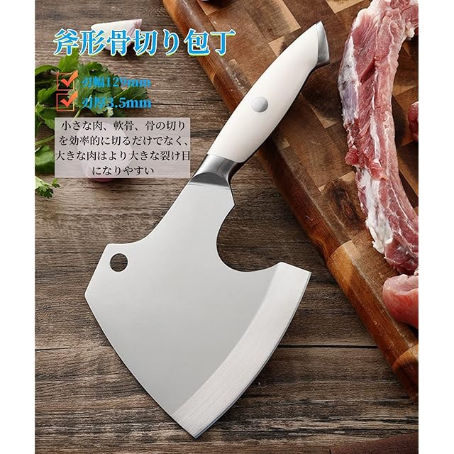 【仕様】品名:白柄・斧形骨切り包丁。サイズ: 刃渡り123mm/全長258mm/柄丈135mm/刃幅129mm/刃厚3.5mm。材質:刃材5Cr15MoVステンレス鋼/硬度57±2HRC/柄材ABS樹脂、重量465g。