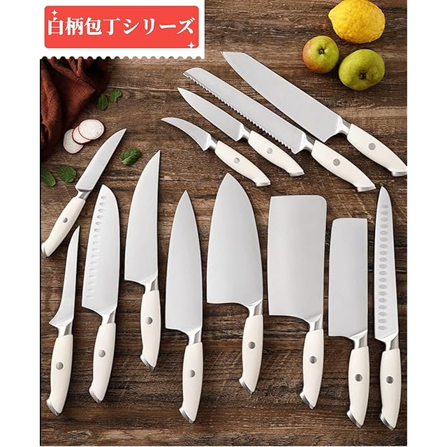 【基本情報】品名:白柄・肉切包丁 全長327mm 刃渡り200mm 柄丈127mm 刃幅50mm 刃厚2.2mm 重量230g 刃材5Cr15MoVステンレス鋼 硬度56-58HRC 柄材ABS樹脂。