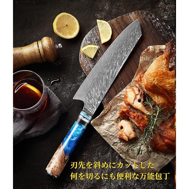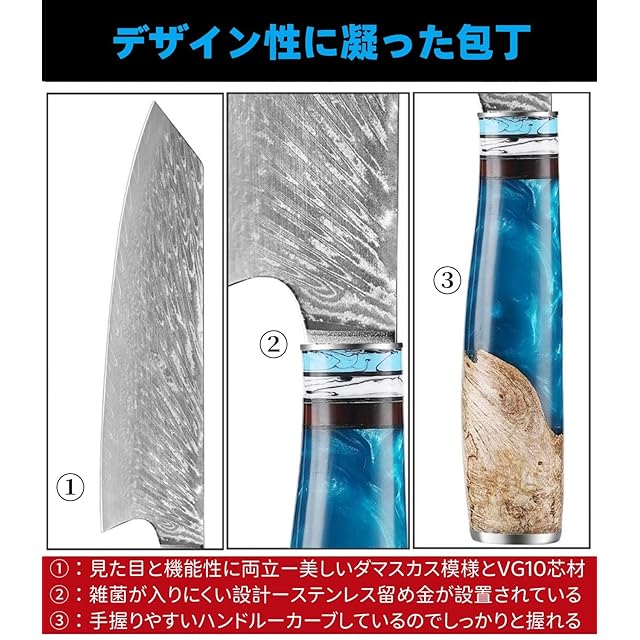 【切れ味】67層のダマスカス鋼は、芯材に高級鋼VG10鋼を使用しており、高硬度、高靭性、耐摩耗性、耐食性などの理想的な条件を備えた材質。もちろん抜群の切れ味とその持続性にも優れ、研ぎ直しもしやすくなっています。