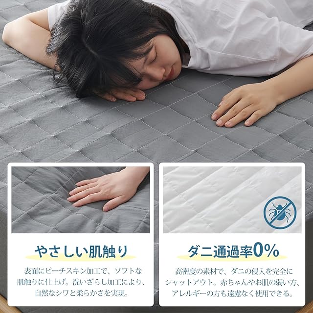 【優しい肌触り】表面はソフトで気持ちいいピーチ生地で、洗いざらし加工により、自然なシワと柔らかさを加え、天然素材の風合いを引き出し、サラサラした触り心地で一年中快適。防水機能・抗菌防臭機能・ダニ対策と機能もしっかりから、赤ちゃんや肌の弱い方、敏感肌の方も安心してお使いいただけます。