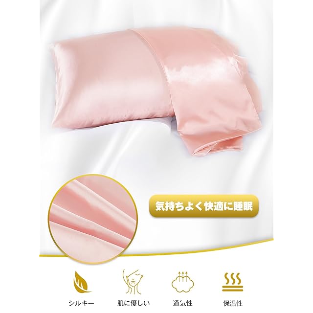 【シルキー枕カバー】ツルツルした肌触りが気持ちよく、縫製もしっかりしています。独特の艶やかな光沢感があり生地は厚めで柔らかです。髪にも肌の敏感なアレルギー体質にも良くアトピーの方にも適されるとのことなので健康的な素材です。