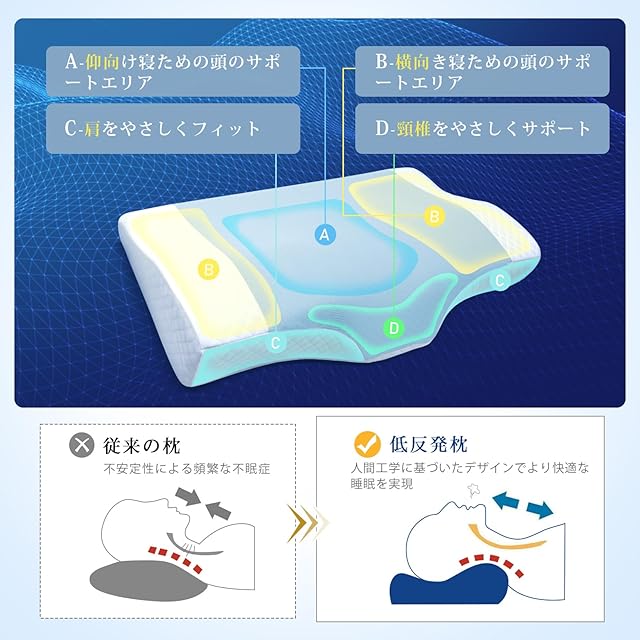 【頭·首·肩を自然にサポート】人間工学に基づいたデザインにより、寝ている間にネックのカーブを自然に保て、首をやさしく支えてくれます。低反発枕は4つのエリアに分かれており、頭が安定し、頭部への負担をかけず、快適な睡眠を実現します。