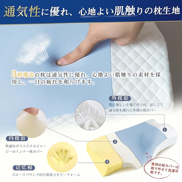【洗濯可能の枕カバー】外側の枕カバーは肌に優しい生地で作られ、涼しくて通気性も優れて、最高の寝心地を実現します。一年中快適に使えて、もちろん洗濯機で簡単にお手入れ可能です。