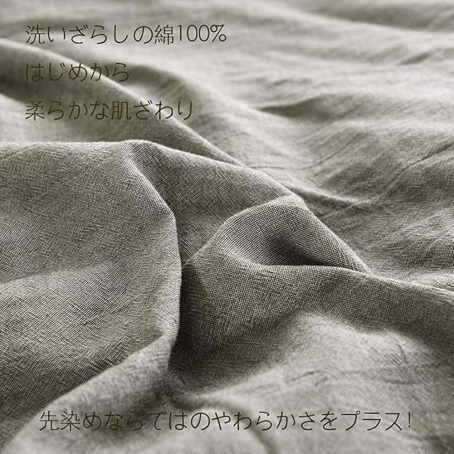 【オーガニックコットン洗いざらしの綿100%】洗いざらし仕上げにより最初から肌になじむように仕上げました。洗濯後のシワも味わいになる洗いざらしの綿です。洗いざらし綿はまるでお洋服のようで、使い込んだ綿だけが持つ風合いに、肌に優しくなじむ柔らかな肌ざわりです。グレーな色合いで幅広い年齢の方にお使いいただけます。