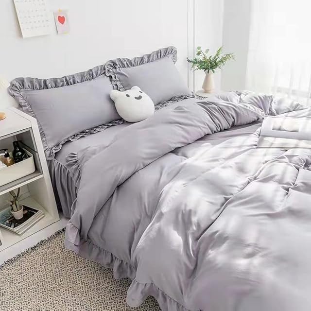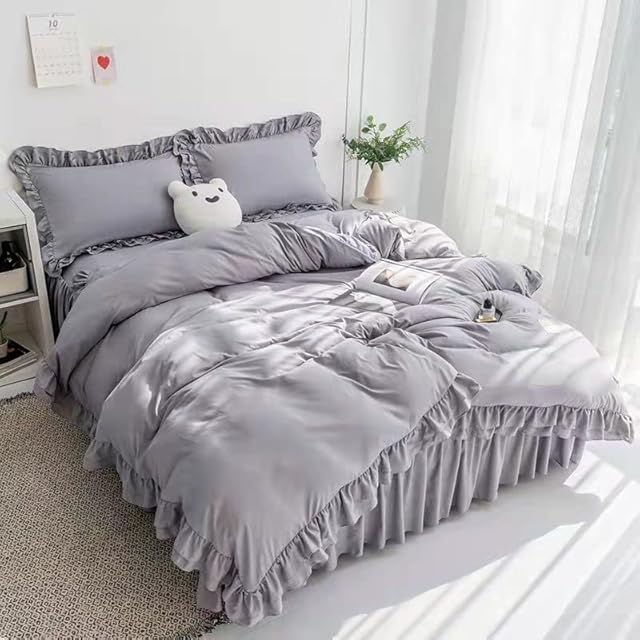 布団カバー シングル セミダブル ダブル 3/4点セット 布団カバー セット フリル 姫風 可愛い シングル掛け布団カバー ベッドスカート 枕カバー カバーシーツセット 肌に優しい フリル付きおしゃれ 北欧 ホテル 安心 清潔 丸洗いOK (グレー, Dダブル-4点セット)