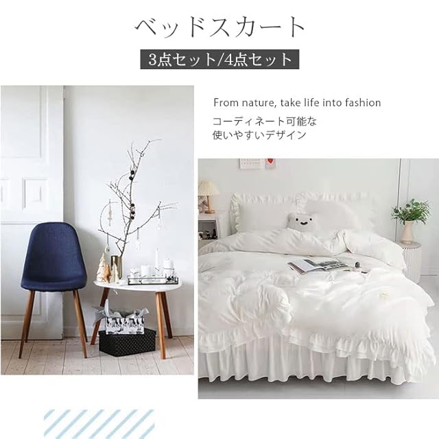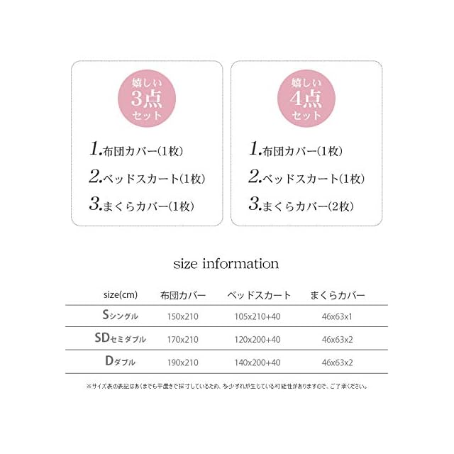 素材:ポリエステル100% サイズ:【Sシングル-3点セット】布団カバー:150cm×210cm+40cmベッドスカート:105cm×210cm+40cm枕カバー:46cm×63cm 1枚 【SDセミダブル-4点セット】布団カバー:170cm×210cm ベッドスカート:120cm×200cm+40cm枕カバー:46cm×63cm 2枚 【Dダブル-4点セット】布団カバー:190cm×210cm ベッドスカート:140cm×200cm+40cm枕カバー:46cm×63cm 2枚