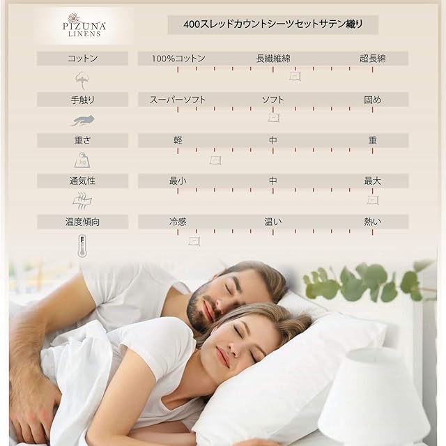 100%無添加&天然のマーセライズ・コーマ綿:Pizuna独自の細番手技術で織り上げた、本物の400スレッドカウント枕カバーは4本上・1本下のサテン織りが特徴です。マーセライズ加工したコーマ綿を使用し、丈夫でなめらかな質感の枕カバーに仕上げました。天然の綿素材は最初こそシワが目立ちやすいですが、洗うたびに柔らかくなりシワも少なくなります。