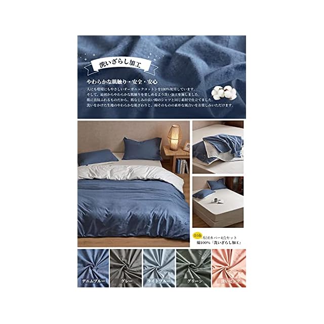 MILDLY 布団かばーシングル 4点セット コットン100% 布団カバーセット シングル:掛け布団カバー ボックスシーツ 枕カバー(2枚入) / 綿洗いざらし加工:柔らかく 変形しにくく 色あせず シンプルな生活が好きな方に(S・デニムブルー)