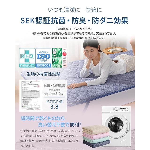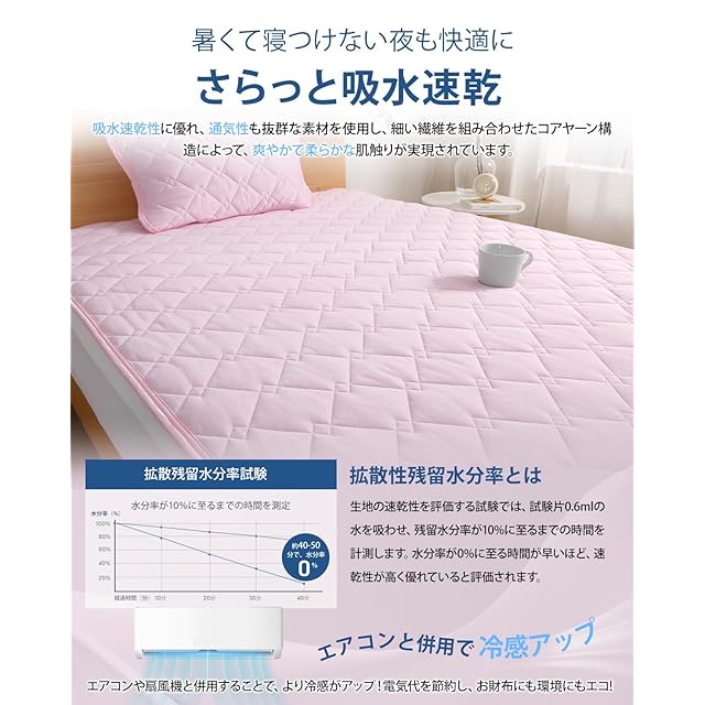 【さらっと吸湿速乾】細い繊維を組み合わせたコアヤーン構造により、柔らかな肌触りが実現されています。冷感敷きパッドは、清涼感をプラスするアイテムとして、冷房や扇風機と併用して暑い季節を快適に過ごしてくださいね。