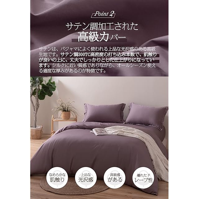 【サテン調加工された高級布団カバーセット】サテンは、パジャマによく使われる上品な光沢感のある高級生地です。サテン調300TC高密度の打ち込み本数で、肌触りが良いの上に、丈夫でしっかりとした仕上がりになっています。特徴:●なめらかな肌触り●上品な光沢感●高級感がある●優れたドレープ性