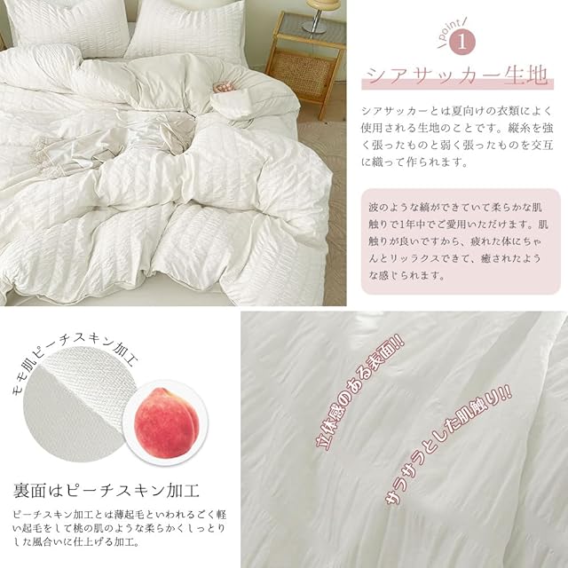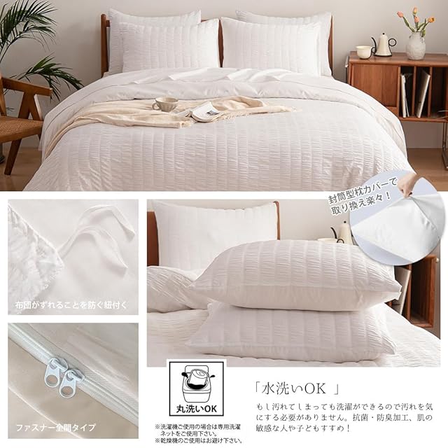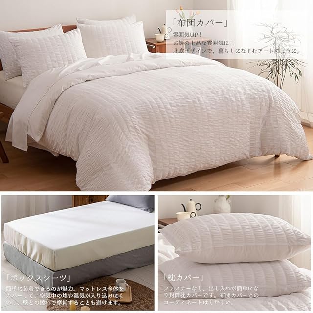 布団カバーセット シアサッカー生地 シングル ダブル 寝具カバーセット 3点セット 掛け布団カバー ボックスシーツ 枕カバー 可愛い 柔らかい 快適 通気性 速乾タイプ 丸洗い オールシーズ(シングル3点セット、ホワイト)