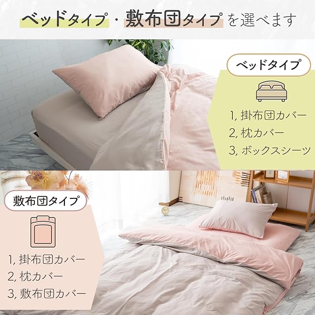 【商品仕様】カラー:ピンク グレージュ のツートンカラー 組成:ポリエステル100% ピーチスキン加工 サイズ:掛けカバー 150×210cm BOXシーツ 100×200×25cm(20cmまでのマットレスに対応しております) ピロケース 43×63cm (ファスナーを使わない封筒型です)