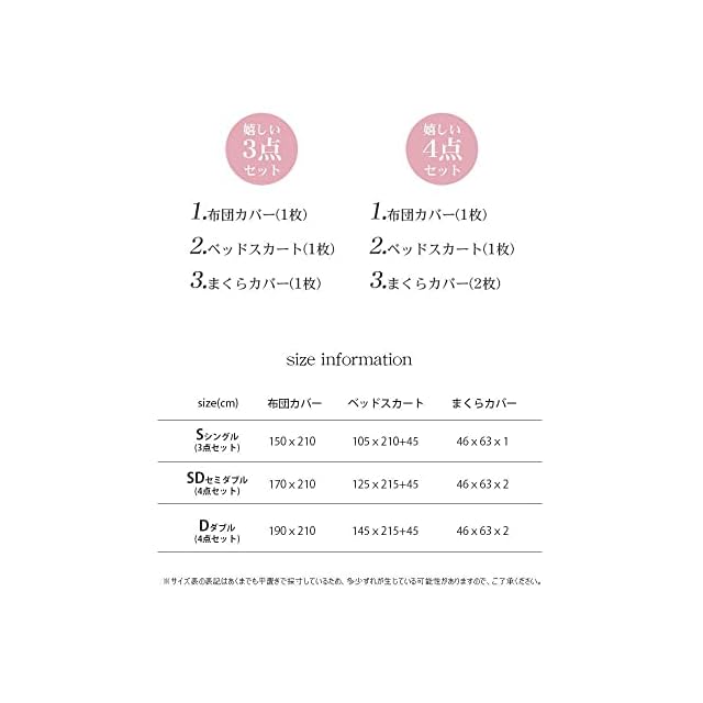 【シングル3点セット】 布団カバー:150×210cm ベッドスカート:105×210cm+45cm(マチ) 枕カバー:46×63cm×1枚 【セミダブル4点セット】 布団カバー:170×210cm ベッドスカート:125×215cm+45cm(マチ) 枕カバー:46×63cm×2枚【ダブル4点セット】 布団カバー:190×210cm ベッドスカート:145×215cm+45cm(マチ) 枕カバー:46×63cm×2枚