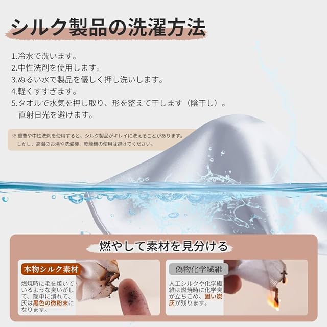 当店の商品の真実性をご確認頂きお客様を歓迎します。シルクの鑑定方法の1つは燃焼法です、シルクの一部を燃やしてみると、本物の絹は燃焼時に毛を焼いているような臭いがします。灰は黒色の微粉末になります。一方、人工絹や化学繊維は燃焼時に化学臭が立ちこめ、固い炭灰が残ります。当社の製品は100%の真絹であるため、上記の方法で鑑定が可能です。ご使用の製品には鑑定用のサンプルが同梱されています。