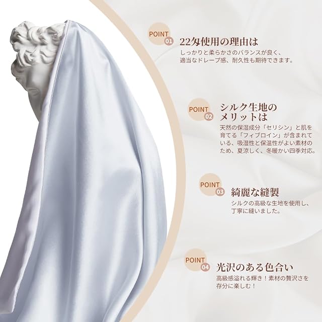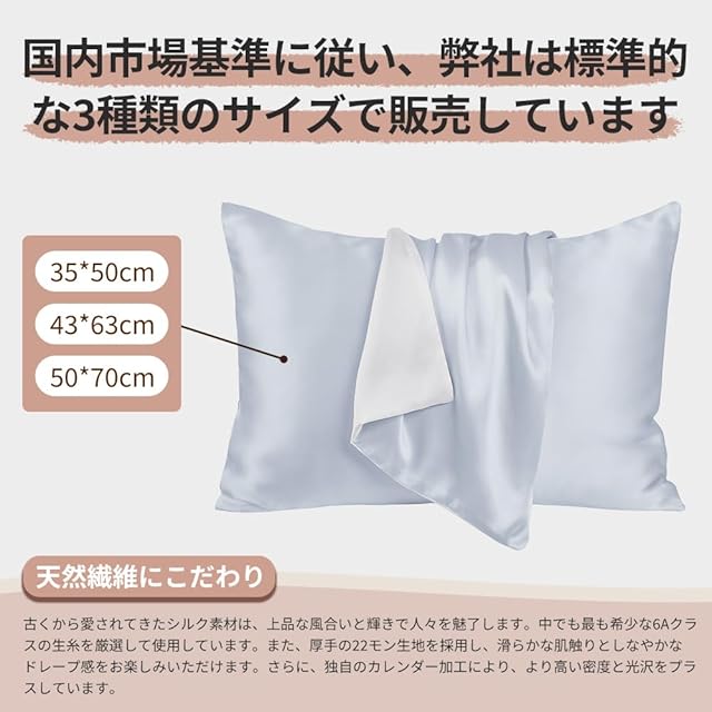 GENKINUのシルク枕カバーは、最高級6Aのシルクを100%使用しており、22匁の厚さの生地が満足感を倍増させます。シルクの特徴は、まずその肌触りです。サラサラツルツルしていて心地良い触り心地を提供します。また、通気性や保湿性にも優れ、機能性も抜群です。オールシーズン使える枕カバーなので、年中快適にご使用いただけます。シルクは18種類のアミノ酸が結合した繊維であり、主成分は人の皮膚と同じ「タンパク質」です。そのため、肌への親和性が非常に高く、肌の悩みを改善する助けとなります。さらに、美肌効果が期待される成分「フィブロイン」や、コラーゲンの主な成分となるアミノ酸がバランスよく含まれています。