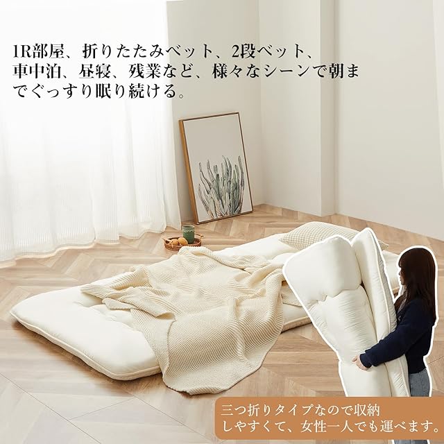 【収納簡単】サイズ:100x200cm。三つ折りタイプなので収納がとてもコンパクト。しっかりしているのに軽量で女性でも持ち運びがラクラク。折りたたみベット、2段ベット、1R部屋、車中泊、昼寝、残業、来客時、帰省など、様々なシーンで使えます。