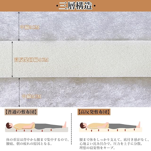 【三層式敷布団】敷き布団の三層構造とは中綿、高反発ウレタン、中綿です。中綿は柔らかくて保温力に優れています。真ん中に高反発ウレタンを採用したので、しっかり体圧を分散して、底付き感がありません。表面生地はピーチスキン加工を施してあるので、手触りの心地よさを実感しながら、優れた通気性を保持します。
