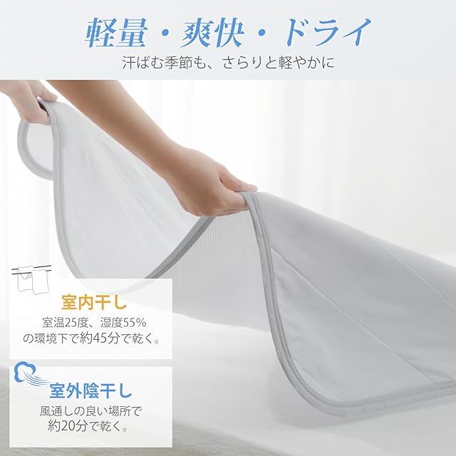 「毎日使いやすい設計」1. 四隅にゴムバンド付きで、ズレにくく安定感抜群。2. 抗菌防臭加工で、汗をかいてもニオイが気になりにくい。3. 洗濯機で丸洗いOK、毎日でも清潔に使える。4. 速乾仕様で、お手入れ簡単。