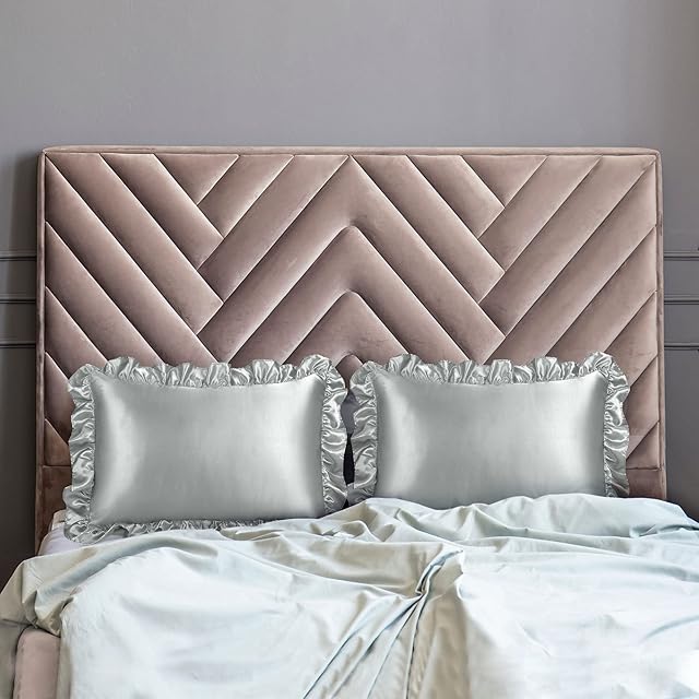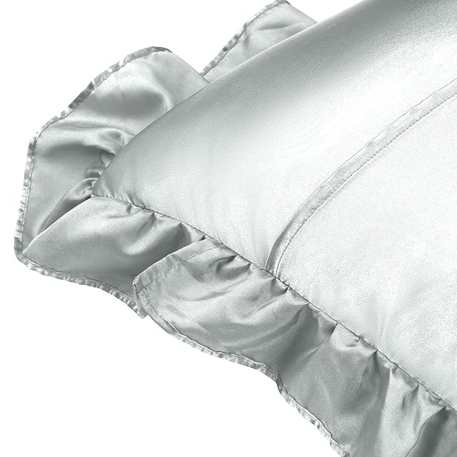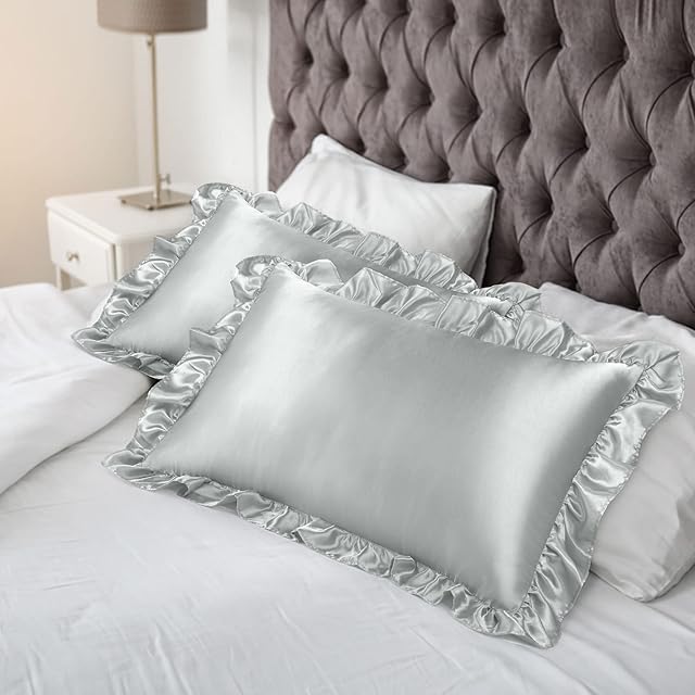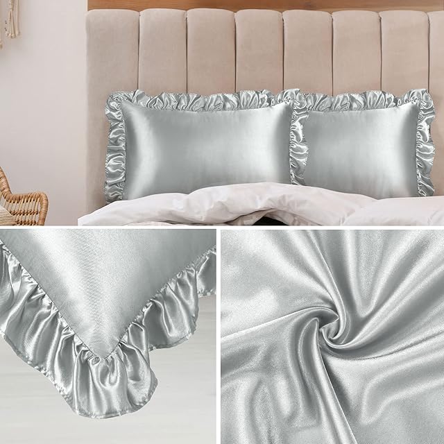PiccoCasa 枕カバー サテン フリル ひんやり レーヨン 封筒式 接触冷感 ピローケース 2枚 セット シルクみたい柔らかい 両面枕カバー 無地 防臭 美髪 美肌 シルバーグレイ 50 x 90cm