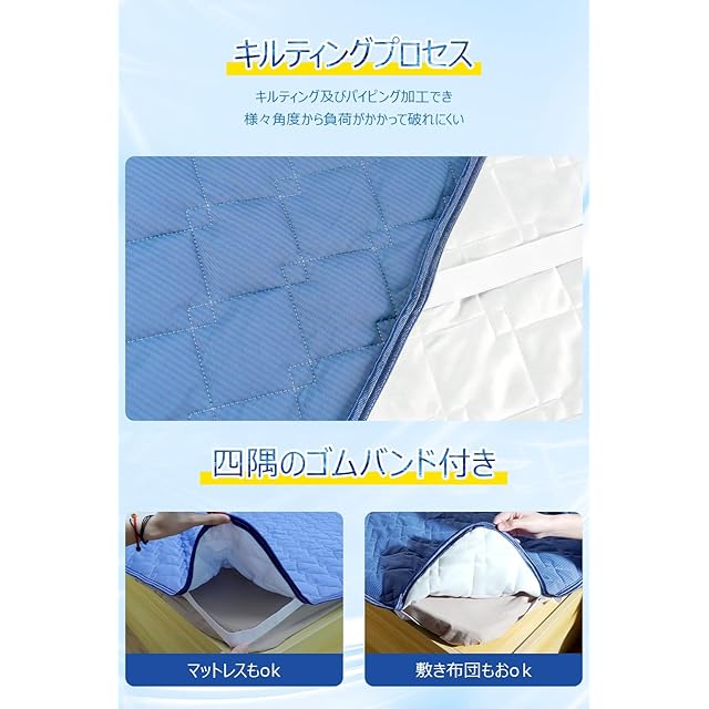 【 ゴムバンド付きで簡単固定】四隅に付いたゴムバンドで、マットレスや敷布団に簡単かつしっかりと固定できます。キルティングとパイピング加工で耐久性がアップし、洗濯機での丸洗いも可能です(洗濯ネット使用推奨)。速乾性に優れ、頻繁に交換したい方にも最適です。シングルサイズの冷感敷きパッドは、夏用の寝具として理想的で、簡単に固定できるので寝返りを打ってもズレません。冷感シーツやひんやり敷きパッドとしても利用でき、冷たい感触を提供します。ベッドパッドやしきぱっととしても活用でき、クールな睡眠環境を維持します。このれいかんシーツは、快適さと実用性を兼ね備えた製品です。