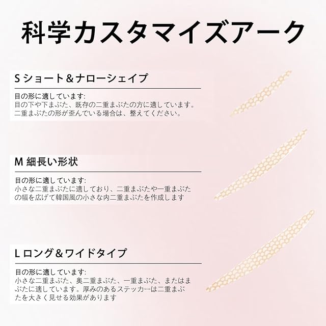 1.なお、このリンクをご購入後、実際にされるのはMサイズの製品です。 自然な二重まぶたテープ仕様: Sサイズ:合計120枚入りで、二重まぶたの女の子の細かい調整に適しています。 Mサイズ:合計108枚。人気の韓国美容スタイルに合わせて、小さな二重まぶたを作りたい、まぶたを広げたい、または小さな奥二重効果を作りたい人に適しています。 LサイズとL2サイズ:合計120枚入り、小さな二重まぶたや二重まぶたに最適で、最も大きな効果があります。 オリーブタイプ:一重まぶたや腫れぼったいまぶたに適した、合計90枚入り。