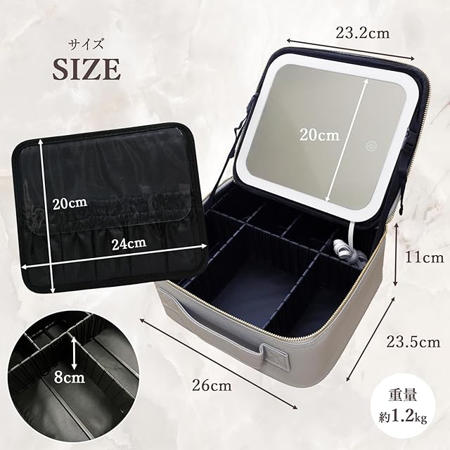 【素材】PUレザー、ポリエステル、ガラス 【サイズ】約26×23×11cm、重量:約1.2kg 【付属品】メイクボックス、ミラー(取り外し不可)、間仕切り大×1、中×2、小×3、メイクブラシケース、USB充電ケーブル
