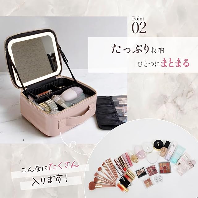 【LEDライト付きのミラーを内蔵した、便利でキュートなコスメポーチ】無段階で光の明るさを調整でき、3段階の色温度切り替え(昼白色・電球色・温白色)が可能だから、シーンに合わせて理想のメイクが叶います♪
