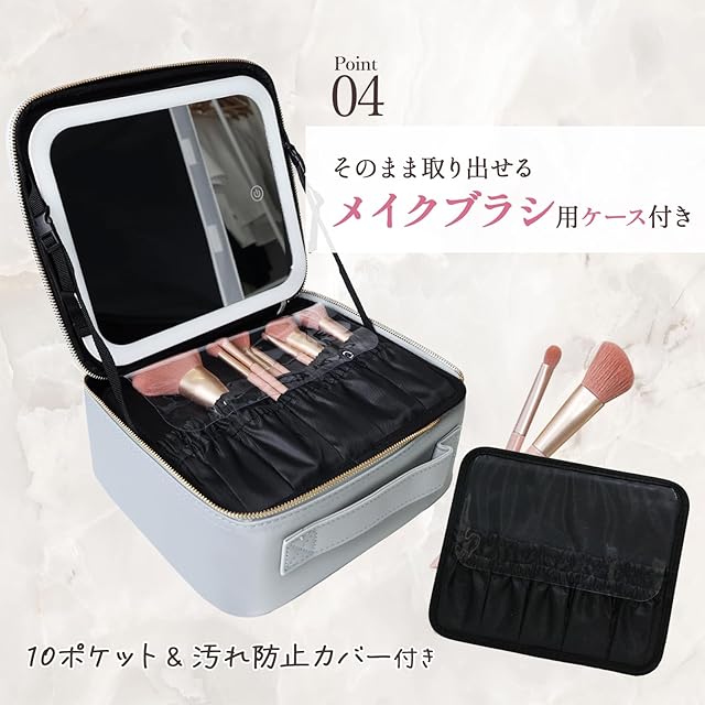 【こだわりポイント】20×23cmのビッグミラー付きでメイクしやすい◎ サイドのストラップで、鏡の角度調整が可能です!また、間仕切りが自由にレイアウトできるので、大きめのパレットや小さめのワンカラーアイシャドウもジャストフィットで収納できます♪さらに、メイクブラシ専用ケース付きで、サッと取り出せてとっても便利♪汚れ防止カバー付きなので、ボックス内がブラシで汚れる心配もありません!