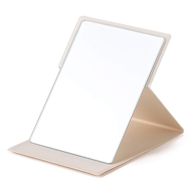 【軽量コンパクト・角度調整可能】自由な角度に鏡を調整できるように、本体生地に滑りにくい素材を使っています。また、ミラーの裏面には滑り止め防止のクッションゴムも付いています。さらに最大角度に傾斜させる際はロックラインも入っていますので、ずり落ちることがありません。従来の折りたたみミラー(当社比)よりも薄く軽いので、場所をとらずコンパクトに収納でき、引き出しやバッグに入れても邪魔になりません。旅行やお出かけ時など持ち運びに便利です。B5サイズのノートとほぼ同じサイズ。お顔全体が映りますので、ご自宅でのメイクに最適なサイズです。サイズ17.6cm×23cm、厚み0.85cm、重量約370g