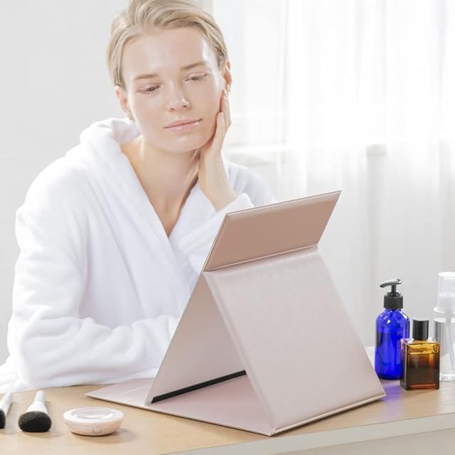【軽量コンパクト・角度調整可能】お好きな角度でメイクが出来るように角度調整可能なロックラインが付いています。また、ミラーの裏面には滑り止め防止のクッションゴムも付いています。収納時は軽量でコンパクトなので、引き出しやバッグに入れても邪魔になりません。旅行やお出かけ時など持ち運びに便利です。カバーはクッション素材でバッグに入れても割れにくくなっています。サイズ18.5cm×28cm、厚み1.5cm、重量約435g