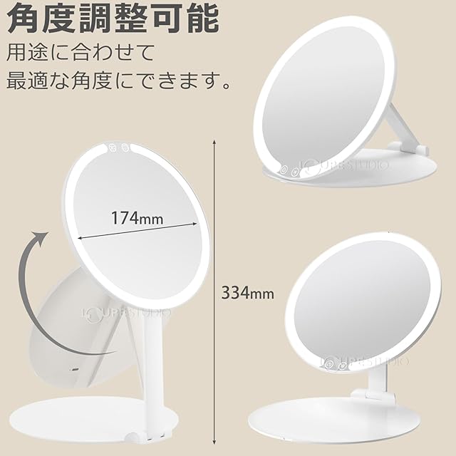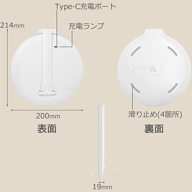 品名:LEDライト付きメイクミラー、サイズ:200mm×214mm×19mm、重量:(約)440g、材質:ABS、ガラス