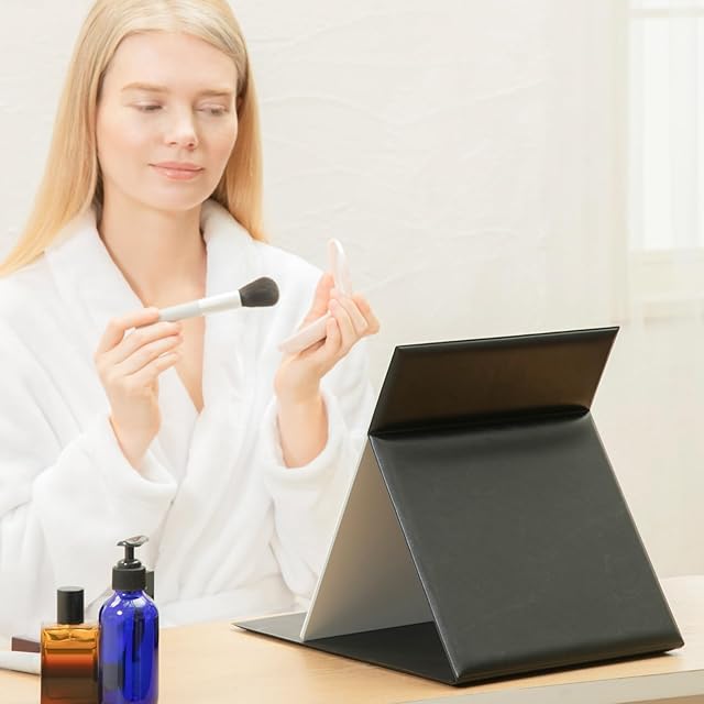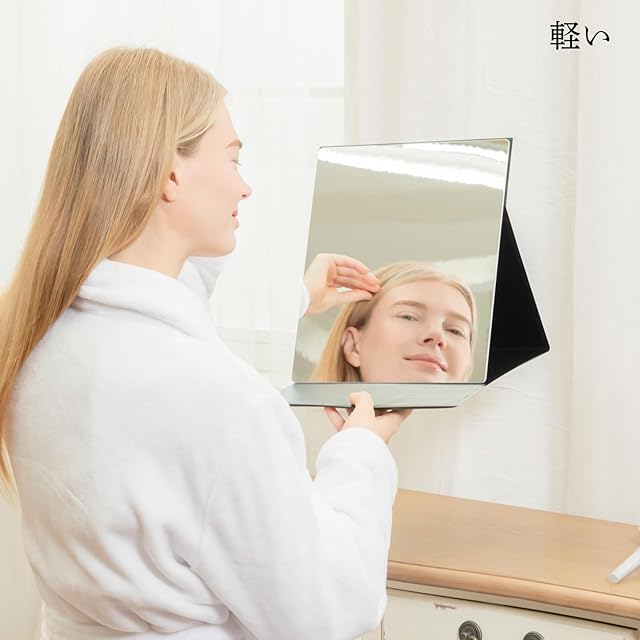 【メイクがしやすい】軽くて割れないので持ち運びに便利です。鏡面も広くてメイクのしやすい角度に調整できるように角度調整のストッパーが3ヶ所は入っています。全体サイズ:約255mm x320mm x 15mm 重量:約650g