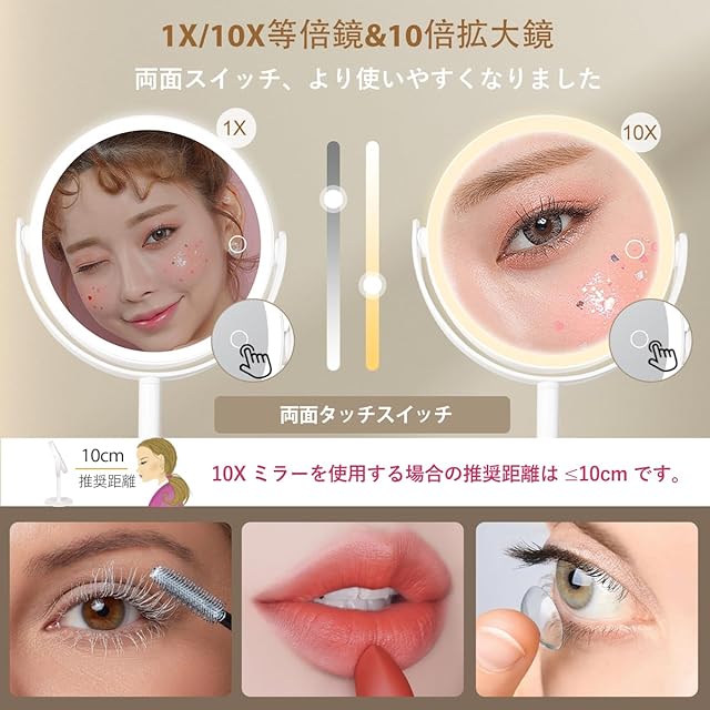 商品名:MILEDUO 鏡 化粧鏡 ライト付き 女優ミラー 等倍と10倍拡大 両面LEDミラー 三つ色モード 明るさ調節可能 360度回転 USB充電式 両面スイッチ タッチ式 卓上ミラー スタンドミラー