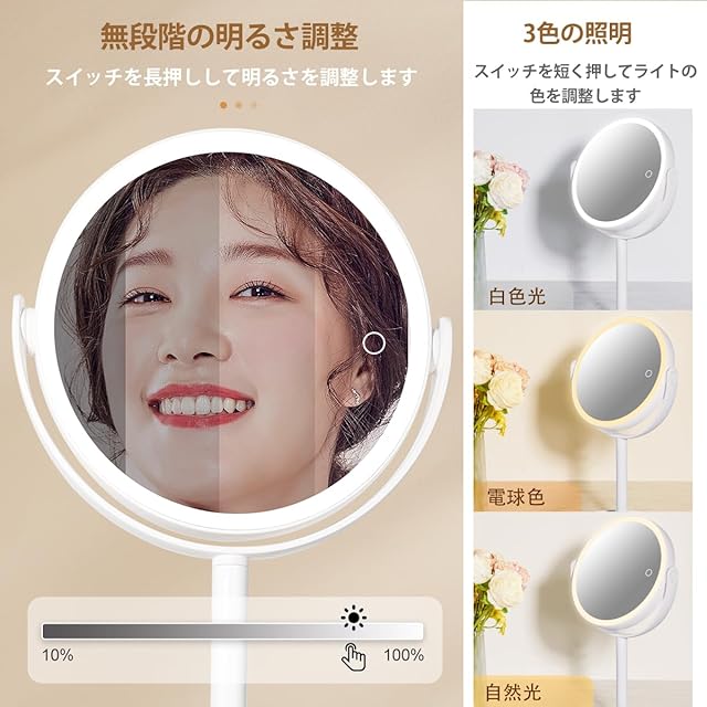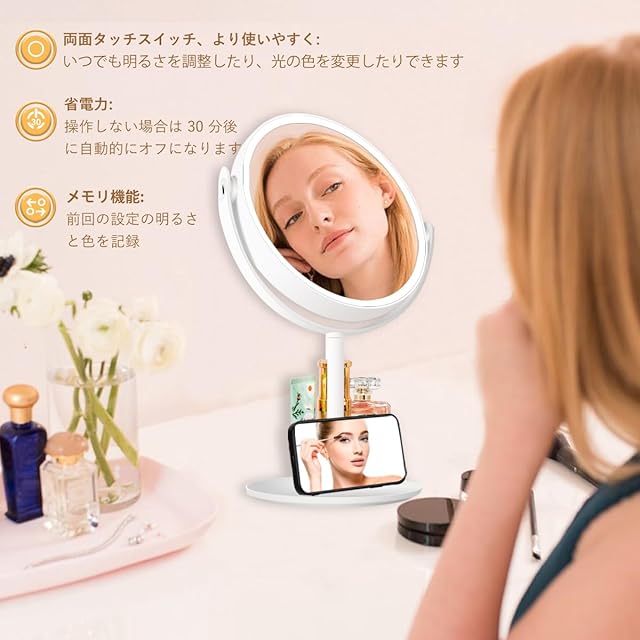 3色無段階調光:3色、無段階の明るさ。照明をカスタマイズします。短く押すだけで、白色光、暖色光、自然光を簡単に切り替えることができます。長押しして明るさを調整し、どんな状況でも完璧な輝きを実現します。あなたの美容ルーチンを明るくしましょう!ミラーの両側にタッチボタンがあり、平面鏡と拡大鏡を切り替える際に光を簡単に調整できます、調整スイッチを見つけるために裏返す必要はありません。さらに、この発光化粧鏡には30分間のタイマーシャットダウンとメモリ機能が付いています。最後に使用した明るさを記憶します。