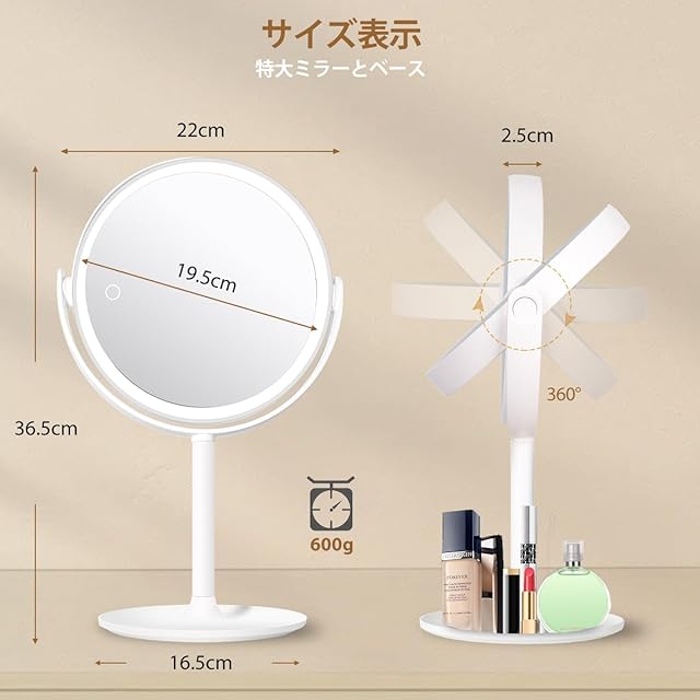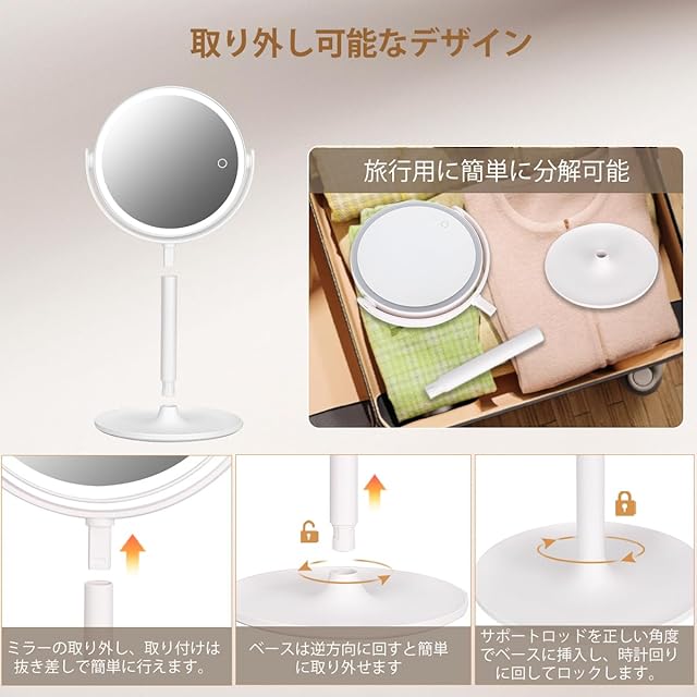 360°回転と取り外し可能なデザイン:照明付きバニティミラーのミラー部分は360°自由に回転でき、最適なメイク角度を捉えることができます。バニティミラーは3つの部分に取り外し可能で、スーツケースやバックパックに簡単に収まります。旅行の必需品の鏡になります。メイクアップミラーベースは安定しているだけでなく、多くの小さな化粧品やメイク道具を収納する収納トレイとしても使用でき、カウンタートップをきれいに保つのに役立ちます。