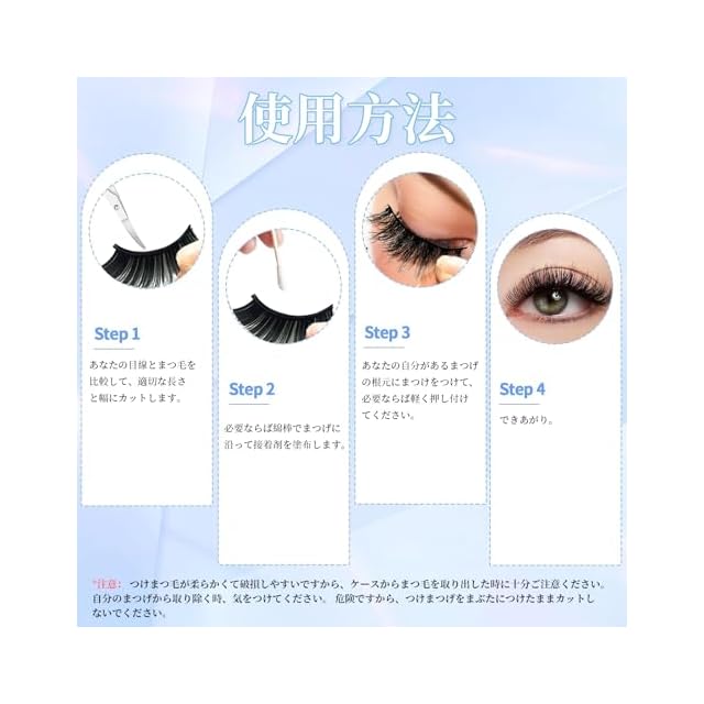 ご注意: つけまつ毛が柔らかくて破損しやすいですから、ケースからまつ毛を取り出した時に十分ご注意ください。自分のまつげから取り除く時、気をつけてください。 危険ですから、つけまつげをまぶたにつけたままカットしないでください。