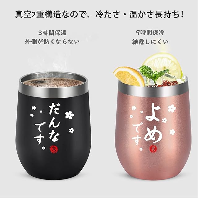 プレゼントにオススメ:結婚祝い・結婚記念日プレゼントにオススメ!誕生日のプレゼントにもぴったりです。かわいい真空断熱タンブラー 「 だんなです& よめです 」。文字が面白いだけでなく、夫婦でアイスコーヒー、ビール、乾杯ができます。夫婦仲が深まりますね!