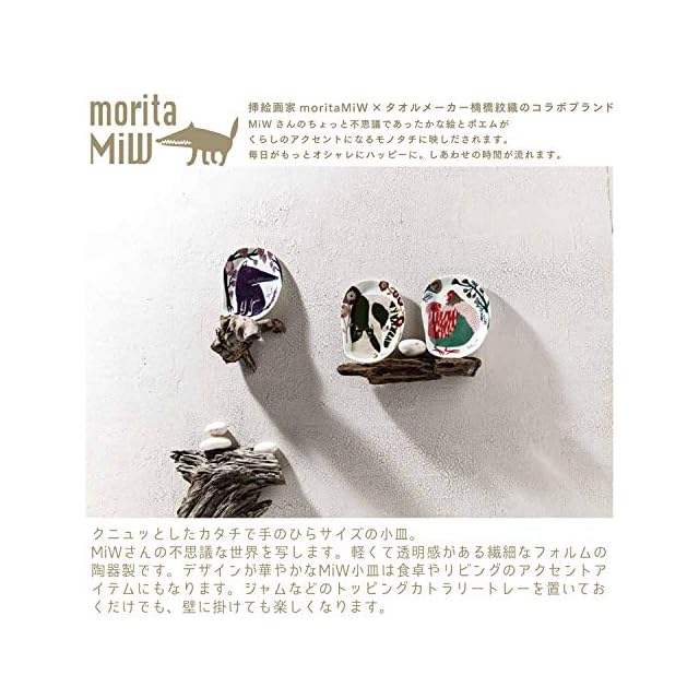 クニュッとしたカタチで手のひらサイズの小皿。MiWさんの不思議な世界を写します。軽くて透明感がある繊細なフォルムの磁器製です。デザインが華やかなMiW小皿は食卓やリビングのアクセントにもなります。ジャムなどのトッピング、カトラリートレー、お菓子をのせるプレートやおしゃれなアクセサリートレー置いておくだけでも、壁に掛けても楽しくなる。小皿の裏面にはかわいいmoritaMiWのロゴ刻印がデザインされています。オリジナルパッケージ入りなので大好きな方へのプレゼントにも、ピッタリです。