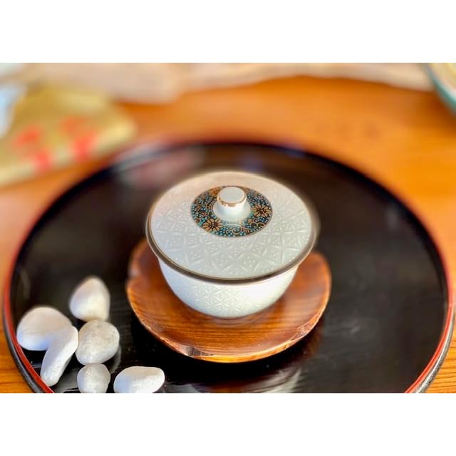 九谷焼の上品な蓋付きのお湯呑です。お寺さんやちょっと気のはる来客のおもてなしに最適です。九谷焼組合さんからの仕入れ商品です。【製品サイズ等】直径:9.2×高さ7.0cm 重量:220g 容量:80ml 梱包形態:黒紙箱