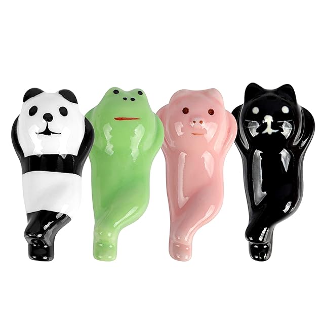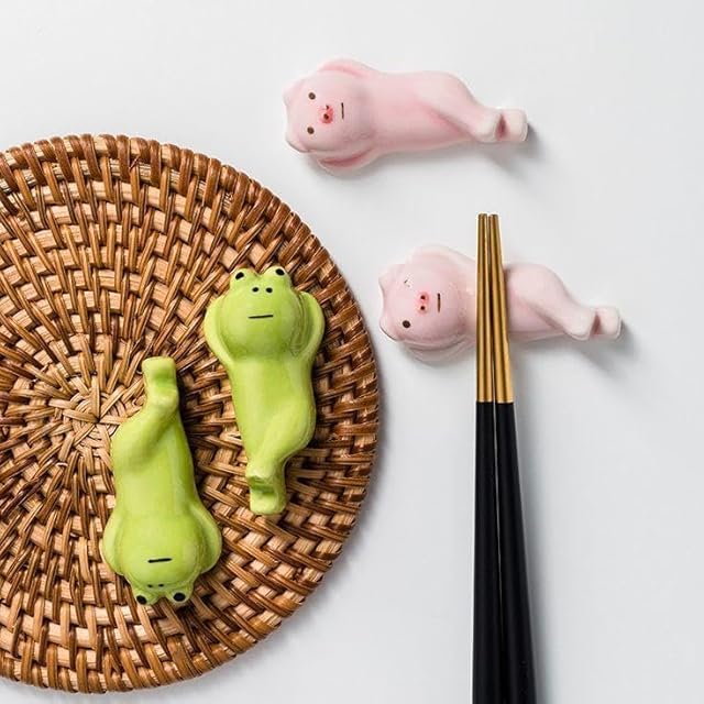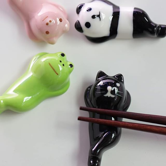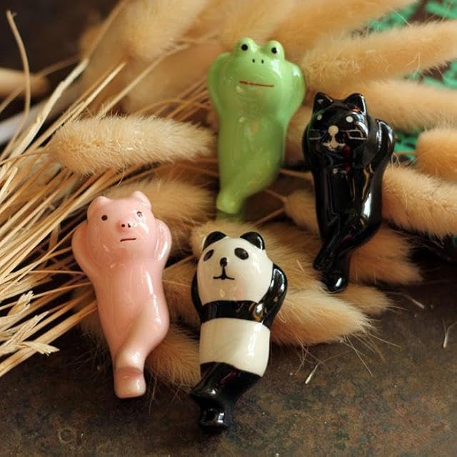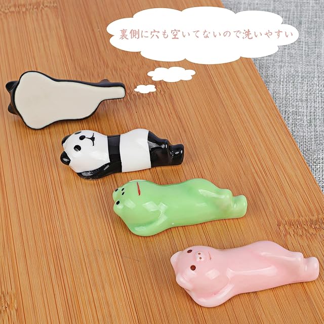カエル・パンダ・ブタ・ネコ 4個セット、 動物が寝そべっているので、箸置きは置きやすいで、細め太めの箸でも何でも問題なく使える。 裏側に穴も空いてないので洗いやすいです。 さまざまな用途があります。