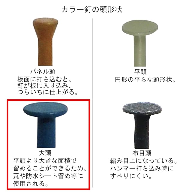 頭部が大きく、トタン板などを留め付けるのに使用する。