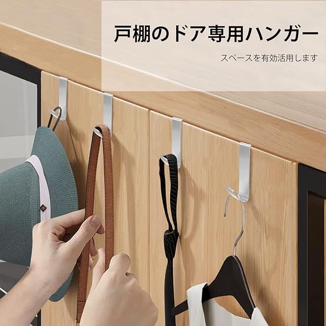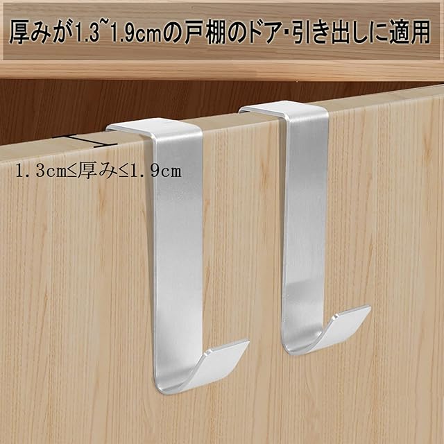 【製品仕様】ドアフック4個組-Mサイズ:2.5*2*11cm。厚さが約1.3~1.9までの戸棚のドアや折れ戸に使用可能、扉と上部の隙間は約1.5mm以上が必要です。