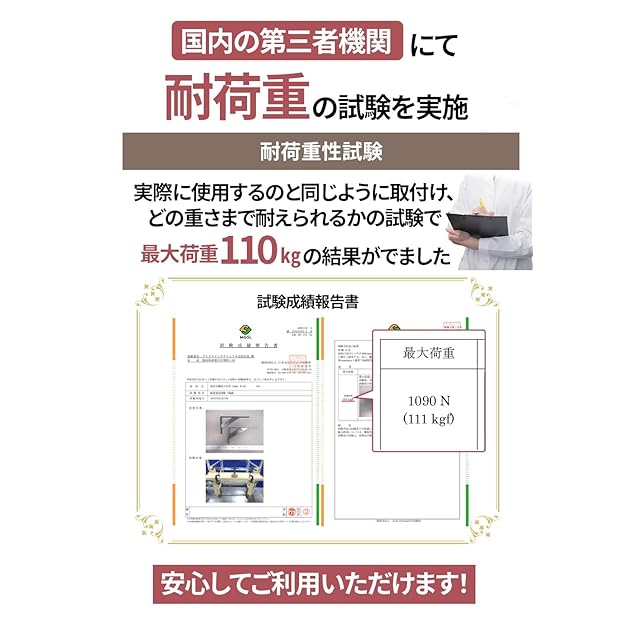【耐荷重性試験実施済み】本商品は日本国内の第三者機関(日本文化用品安全試験所)にて耐荷重性試験を実施し、確かな品質と耐久性が認められた安心と信頼のおける製品です。
