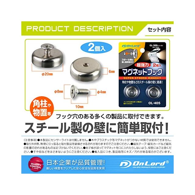 ★ネジ穴・フック穴のある製品の取付に最適★ ●超強力マグネットで穴を開けずにしっかり取付可能! ●フック穴が4ミリ以上のほとんどの製品に対応! ●オンロード製品のセンサーライトOL-300シリーズの取り付けに最適! ●耐久性に優れたメッキ&ステンレス仕様!